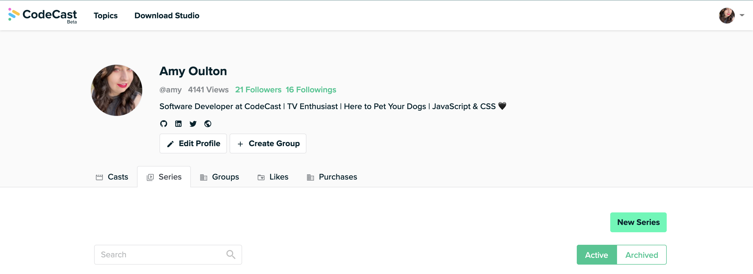 Once you have created an account and are logged in to CodeCast, navigate to your profile. Under the bio portion of your profile, you will see a row of tabs. Click on the tab titled Series.