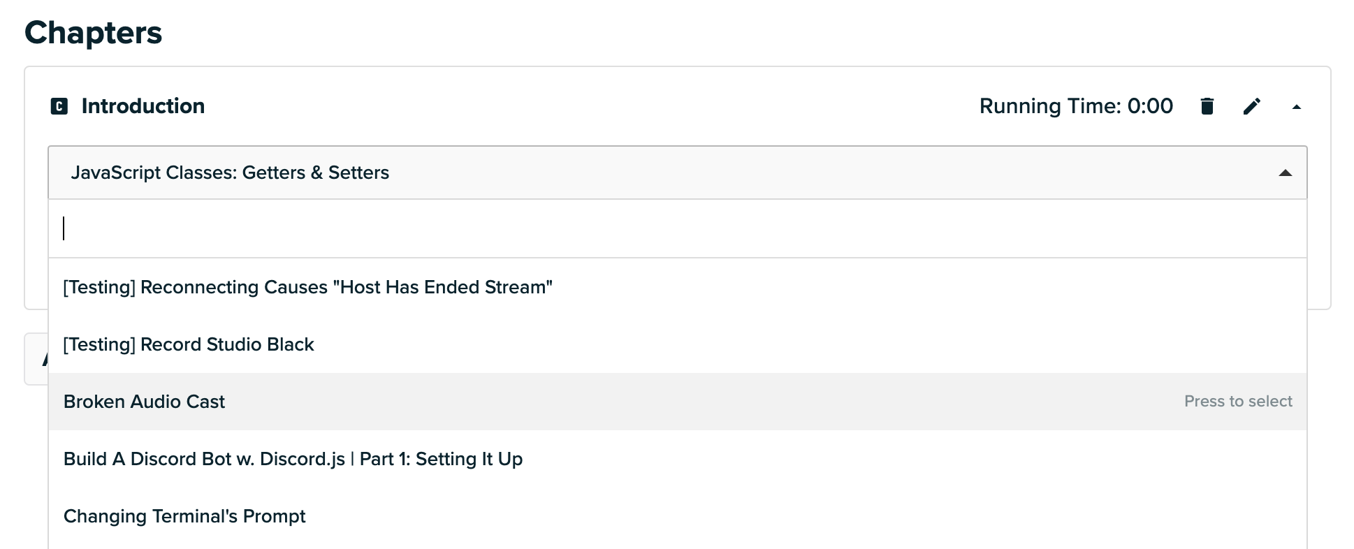 Hit Add Chapter and name the Chapter according to what the section will contain. A dropdown menu will appear within the Chapter section that will allow you to add as many Casts to that Chapter as you’d like!