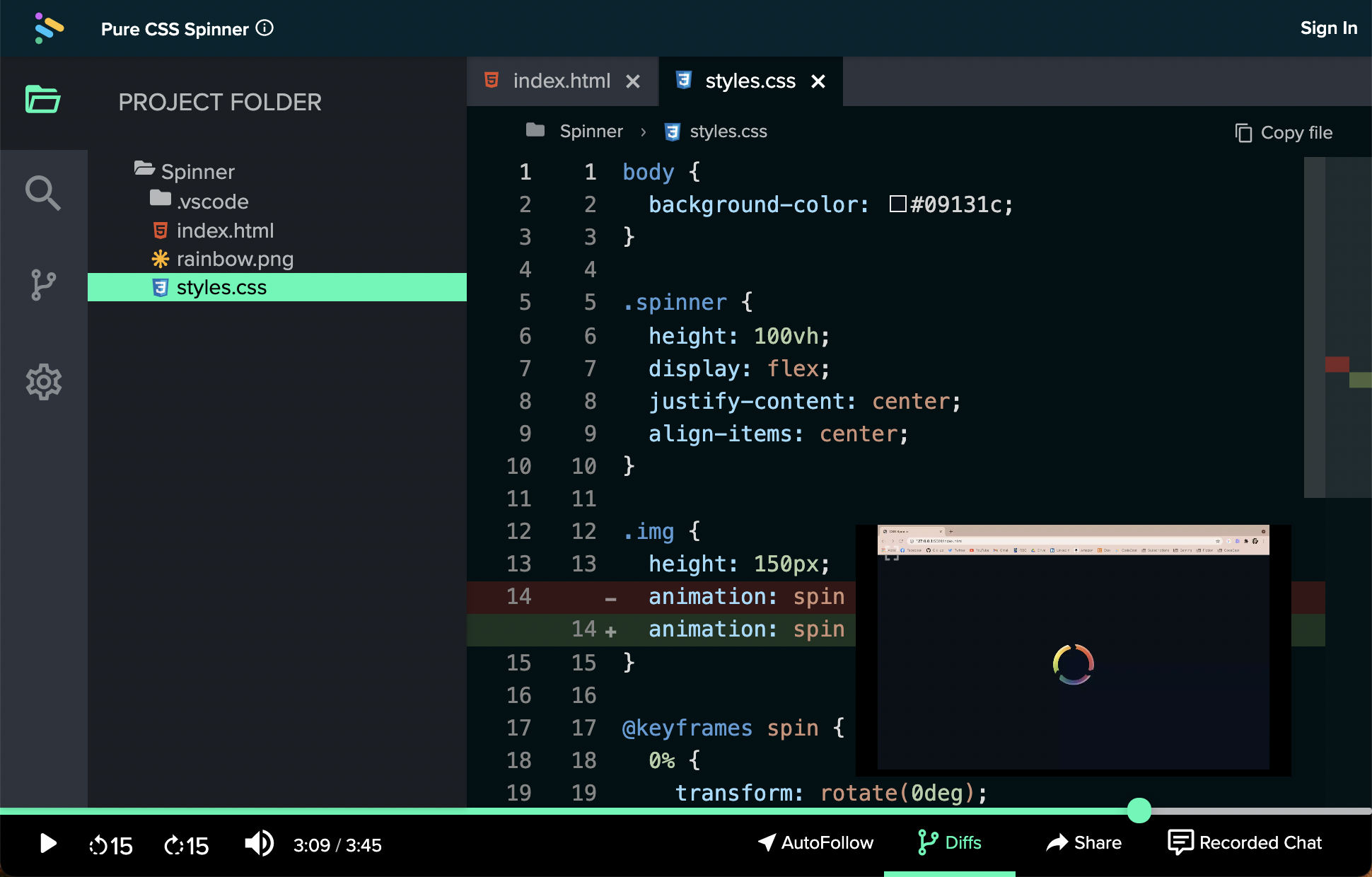 Diffs are a standard coding feature, and one we would never dream of not including. Ours works the same way you’re used to seeing it across all your popular tools. Things removed from the previous save are highlighted in red and have a - sign at the beginning. Things added from the previous save are highlighted in green and have a + sign at the beginning.